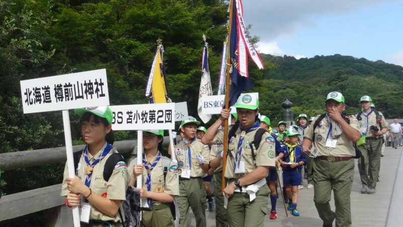 この大会は昭和36年に初開催されて以来5年に一度、伊勢の地で開催されている神社スカウトの最大イベントです。今年のテーマは「神様に笑顔であいさつ 和の心」。ボーイスカウト苫小牧第2団、札幌1団は北海道隊として参加し、信仰の心と友情を深める貴重な時間を過ごしました。