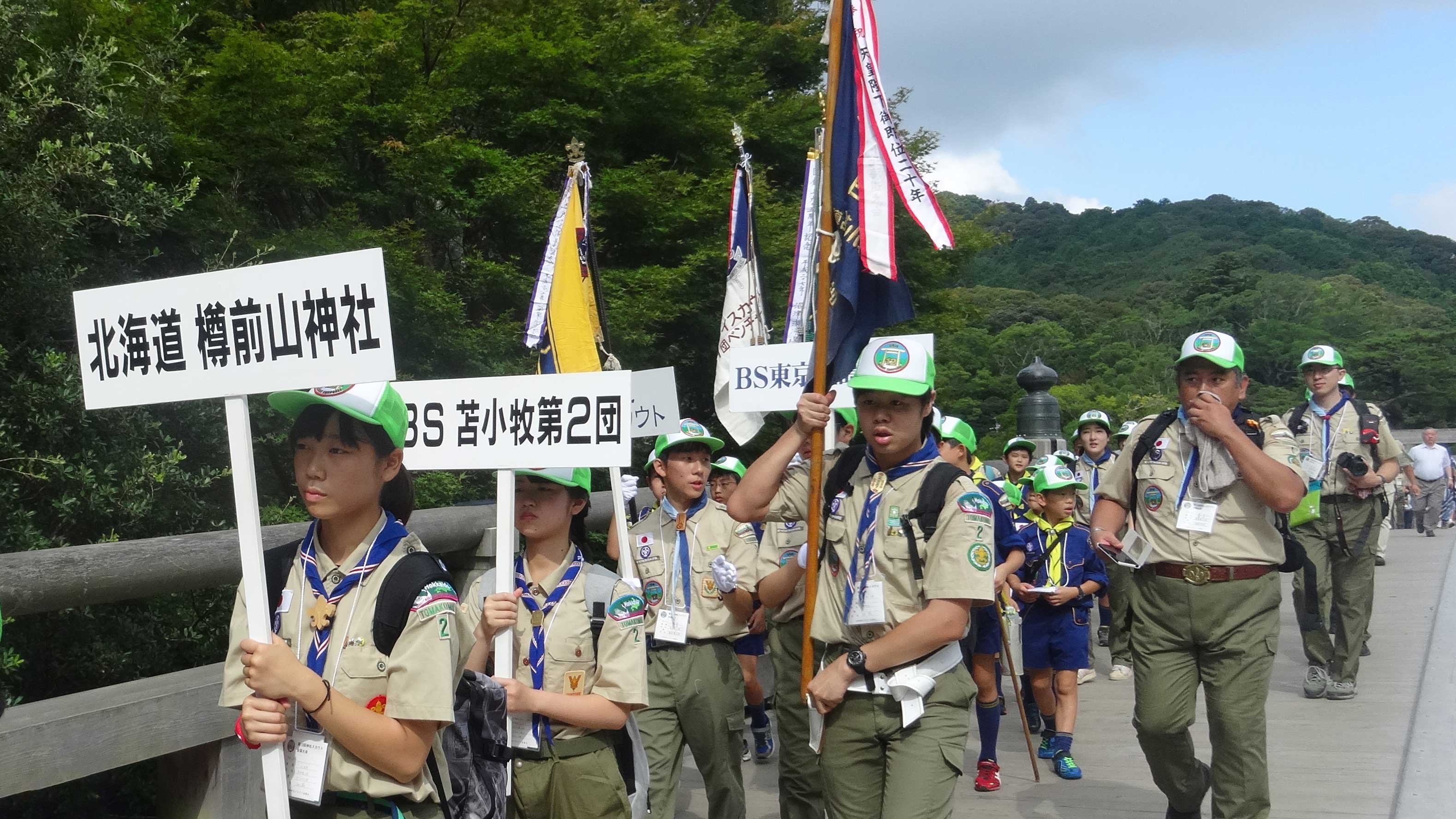 ボーイスカウト苫小牧第2団および札幌1団が北海道隊として参加した第12回神社スカウト全国大会は、平成28年8月6日から9日まで三重県伊勢市で開催されました。神社を母体とするボーイスカウト・ガールスカウトが信仰と友情、スカウト技能の成果を発揮する重要な大会で、伊勢神宮を中心に多彩なプログラムが繰り広げられました。
