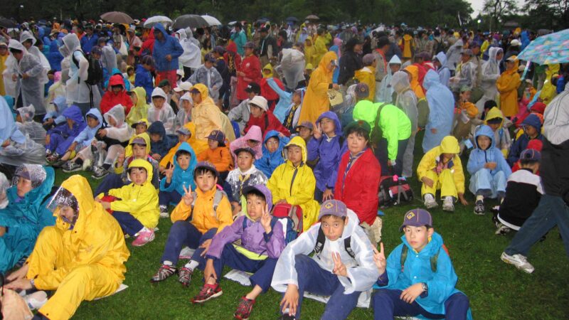催し物が行われるステージでは多彩なプログラムが繰り広げられましたが、夕方には雨が降り始め、傘の代わりにカッパを着ての観覧となりました。それでもスカウトたちは元気を失わず、雨の中でも熱心に楽しんでいました。