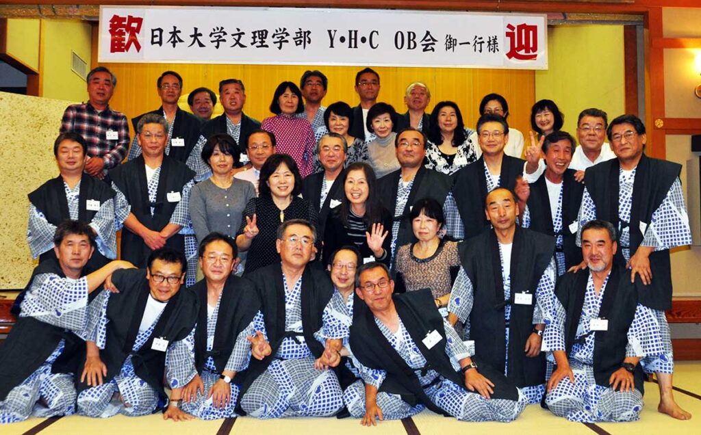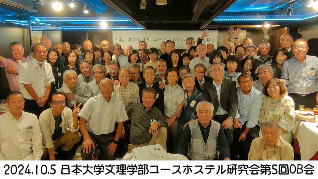 日本大学文理学部ユースホステル研究会の同窓会が5回行われましたが、その集合写真を掲載しました。ただし、第1回目の集合写真は画像が悪かったため、各期で撮った集合写真を切り取って全体の集合写真としていますので、人のサイズにばらつきがありますがご容赦を。今のAIならやってくれるのかな?