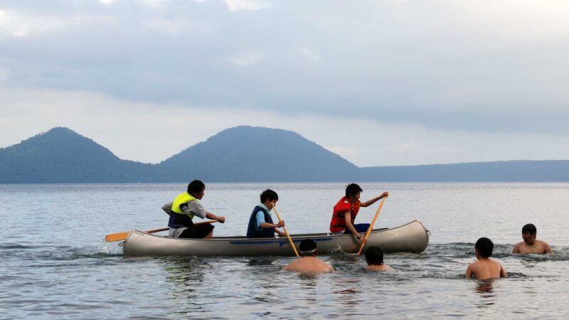 2日目は16キロという、支笏湖周辺の険しい地形を越える厳しい行程。最大標高差420メートルの登りと下り、日陰のほとんどない道を重装備で進むのは並大抵のことではありません。疲労困憊のスカウトもいましたが、班員同士で声を掛け合い、助け合いながら前進。午後3時に支笏湖オコタン野営場に到着し、まずは休息優先。疲れ切った身体でしたが、やはりレクリエーションのカヌーは欠かせず、薄暗くなるまで漕いで楽しみました。