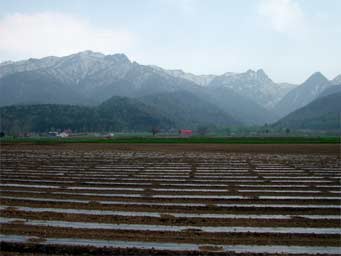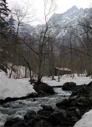 ユーフレ小屋は、ユーフレ沢と熊の沼沢の出会いにある大きな河原に位置し、背景に鋭く切り立った白い山、前にはユーフレ川本流を雪解け水が音を立てて流れ、とてもアルペン的な雰囲気を持っている。