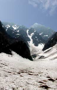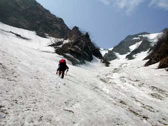 この本谷(地獄谷)は、両岸からの落石や雪魂が落ちてきますので十分注意が必要です。休憩時も下流ばかり見ていないで、上流部にも注意が必要。巻き込まれたら助からないと思われる雪崩あとが3カ所ありました。