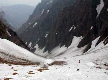避難小屋から30分も進むと河原は狭まり両岸が立ってくる。日本登山大系では1時間あまりで「地獄の門」と書いてあったが?1時間も歩くと空が開いてくる。