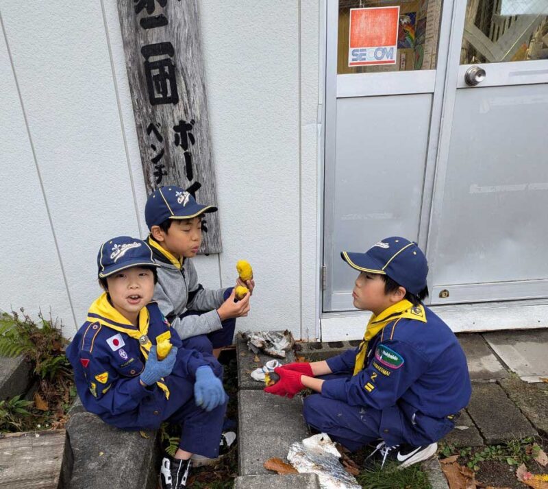 焼きあがったサツマイモは、ボーイ隊のハウス前にある石でできた椅子などに腰掛け、みんながおいしそうに味わいました。少し焦げてしまったものもありましたが、ほくほくの甘さが口いっぱいに広がり、秋の恵みを存分に楽しむことができました。