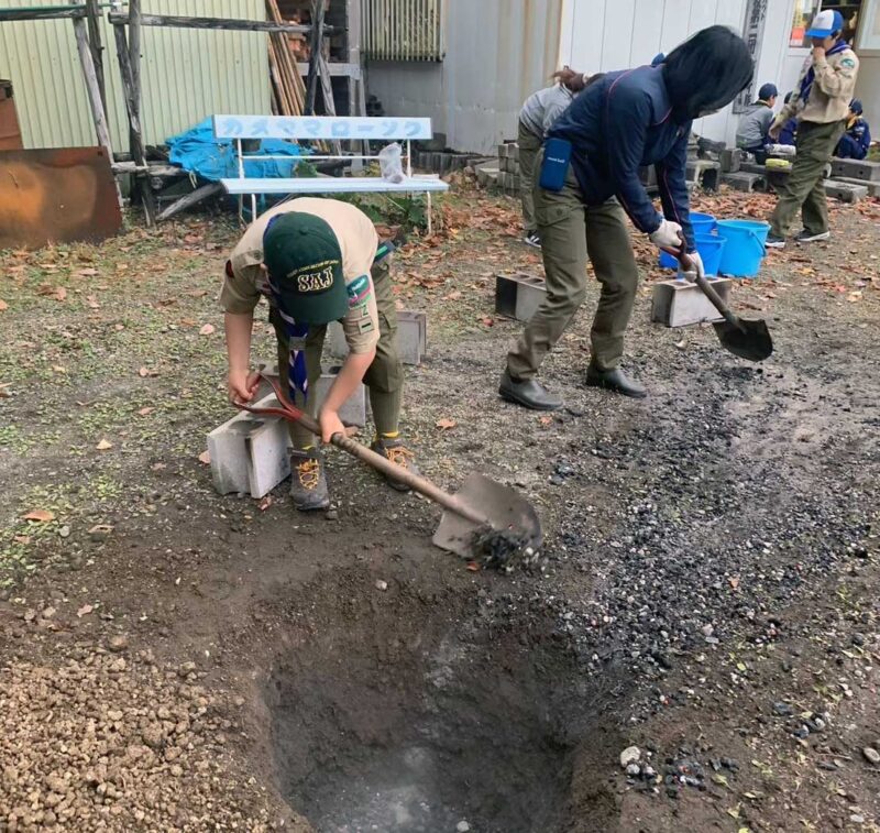 なお、焼け具合を確認しながら熾きの始末も重要な作業で、カブスカウトとビーバースカウトが楽しく大きな穴を掘って燠の処理を手伝いました。その穴は直径・深さともに約60cmという立派なもので、若いスカウトたちの協力の賜物でした。