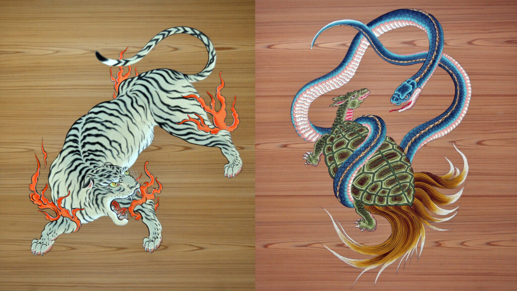この絵は、四神獣(ししんじゅう)で、古代中国の天文学や風水思想に由来する四方を守護する神獣のうちの2神獣です。