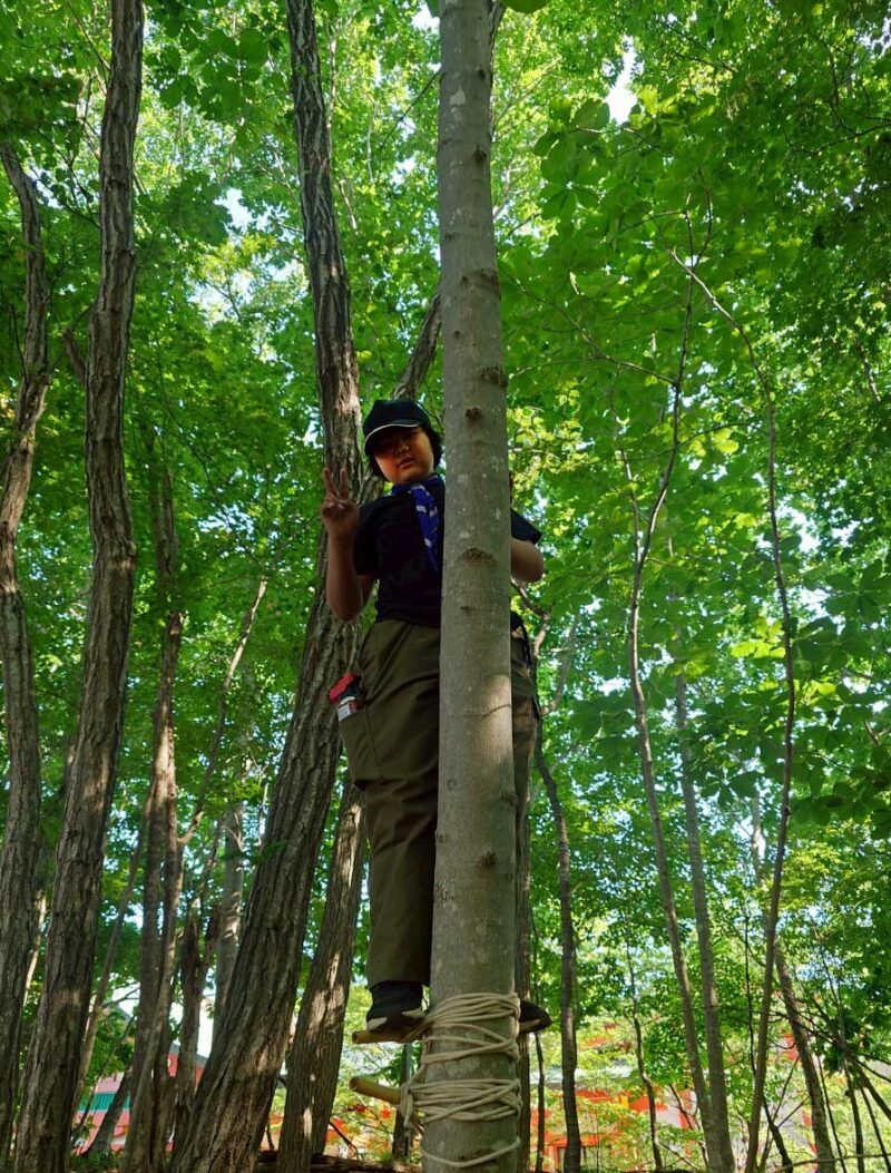 あまり高いところまで登ることはありませんでしたが、普段の活動とは異なる自然環境での体験に、スカウトたちはとても楽しみながら積極的に取り組んでいました。新緑の森の中での活動は、心身のリフレッシュにもなり、仲間との絆を深める良い機会にもなりました。