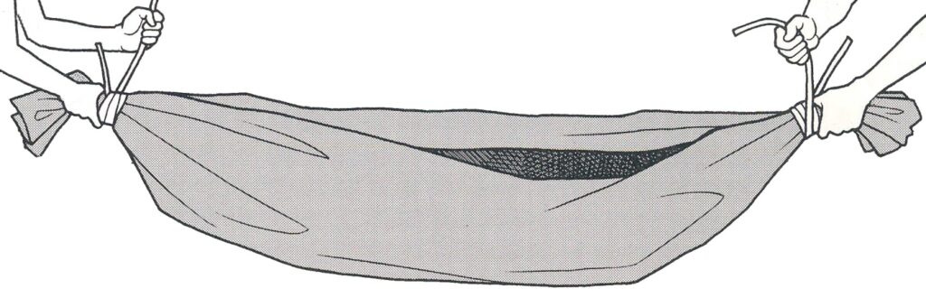 もっともシンプルなキャンディ寝袋を作る。両端をロープで吊ればハンモックにもなる。ブルーシートの両端を寄せあわせ、合せ目をひもでぐるぐる巻いて蝶結びで結ぶ。これに毛布や寝袋があれば十分に野外でも寝られる。