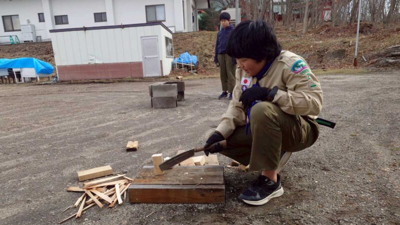 火がついた後は、フライパンを使ってお湯を沸かし、ココアを作って楽しむ時間も設けました。この活動を通して、スカウトたちは火を安全に扱う重要性を学び、ナタの使い方も教わりました。ナタを使う際は必ず周囲の安全を確認し、手の位置や切る方向に注意を払うこと、切り終わったら刃を下に向けて安全に置くことが指導されました。