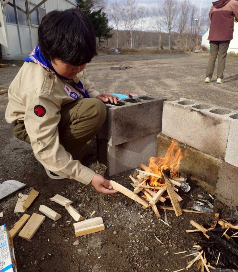 火おこしの場では、ブロックで「コ」の字型にかまどを作り、その中に着火剤として紙を置きました。その上に焚き木を井形(四角形)に並べるのが理想ですが、実際にはスカウトたちはテント型(ピラミッド型)に焚き木を組んで火をつけました。今回はその方法で火がうまくつき、スカウトたちは成功を喜びました。