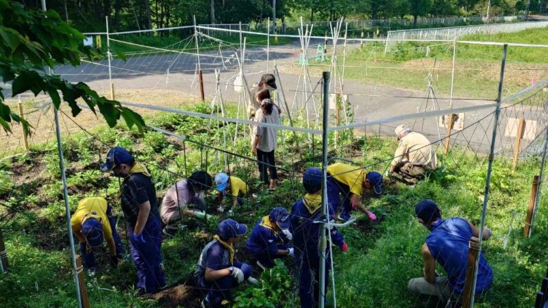 最後に、ビーバースカウトと一緒に草ぼうぼうのスカウト菜園に足を運び、全員で草取りをしました。 雑草を抜きながら、自然と触れ合い、スカウト同士が協力する喜びを感じるひとときです。 汗をかきながら黙々と草を抜く姿からは、まだ小さな身体でのがんばりと成長の跡が見てとれました。