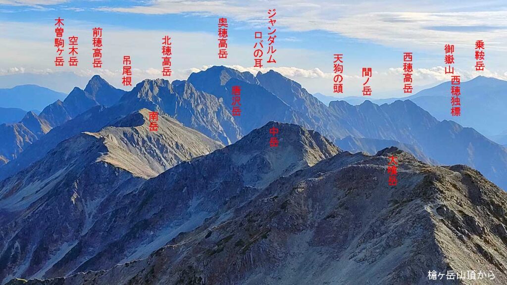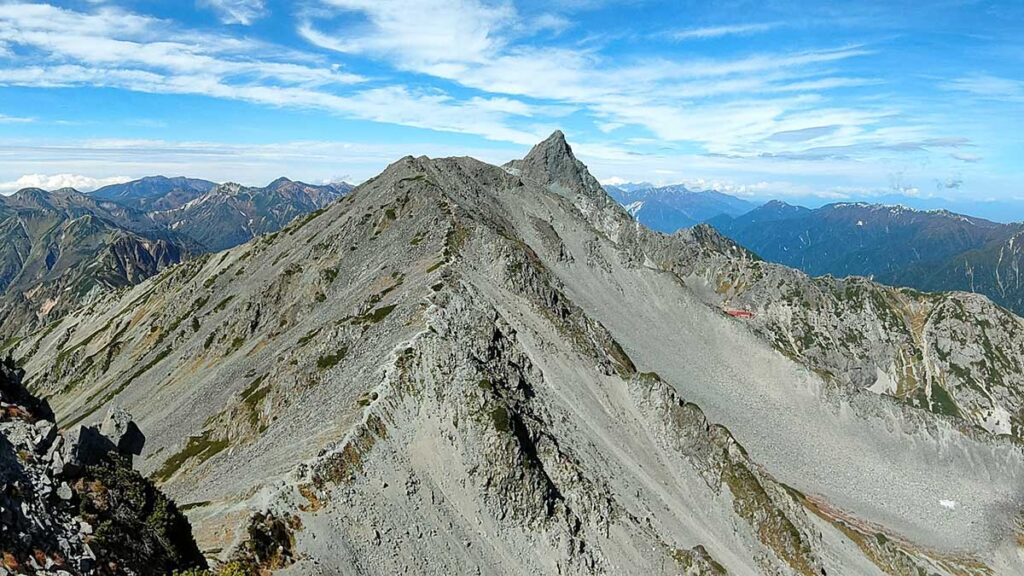 槍ヶ岳山頂から左に鋭利な刃物のような北鎌尾根と独標
