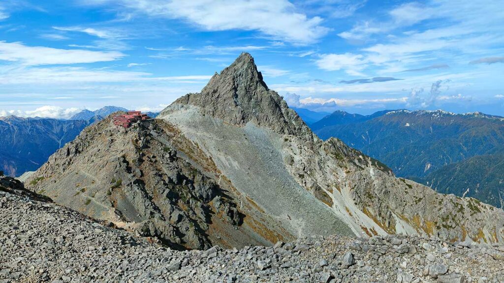 中岳、大喰岳と3000m峰を贅沢に繋いでいく道。このルートの素晴らしさは、常に正面に槍ヶ岳を見据えて歩けることです。大喰岳から飛騨乗越へと下る頃には、槍ヶ岳山荘と、天に突き刺さる「槍の穂先」が眼前に迫り、疲れも吹き飛びます。