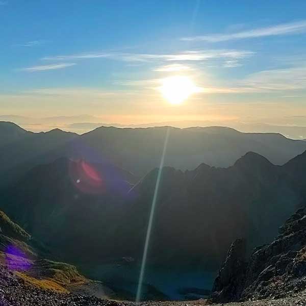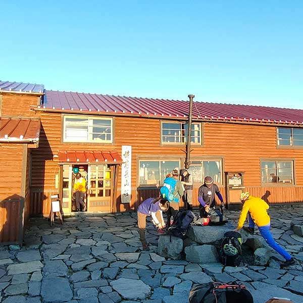 朝6時、穂高岳山荘のテラスは静かな興奮に包まれていました。東の空が白み始めると、眼下の涸沢カールが淡い光に照らされ、山荘が朝日に染まる「アーベントロート」ならぬモーニングロート。この瞬間を見られるのは、山に泊まった者だけの特権です。