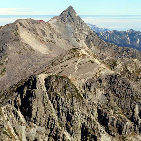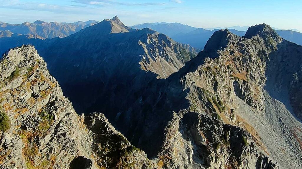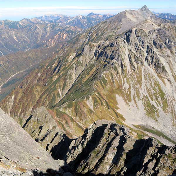 北穂高北峰から手前に獅子鼻岩