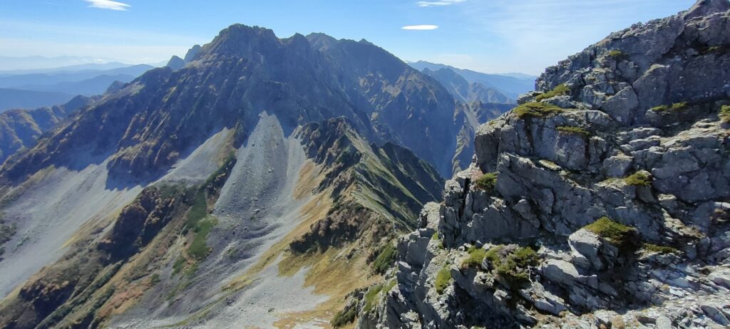 南岳の山頂から先は、これまでの険悪な岩場とは少し趣が変わり、広々とした稜線歩きが楽しめます。南岳の「獅子鼻岩」から大キレットを振り返ると、よくあんな場所を歩いてきたものだと自分を褒めたくなります。