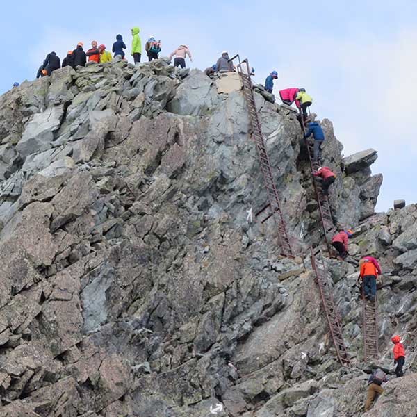 槍ヶ岳の上部はほぼ垂直に近い梯子の連続。30分かけて慎重に登り詰め、15時05分、ついに槍ヶ岳山頂へ!