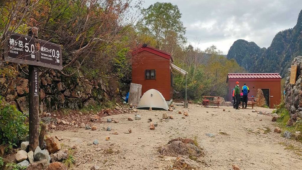 標高を下げていくと、周囲に緑が増え、水の流れる音が聞こえてきます。槍沢キャンプ地に到着すると、カラフルなテントが並び、これから槍を目指す登山者たちが準備をしていました。ここから眺める槍ヶ岳もまた格別です。