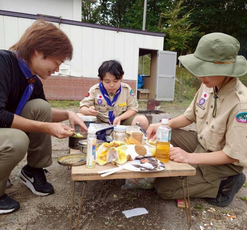 火が安定したところで、いよいよ調理の時間です。メニューはキャンプの定番「カレーライス」。どのスカウトも慣れた手つきで野菜を切るスカウト、米を炊くスカウト、調味を整えるスカウトと分担し、声を掛け合いながら作業を進めました。火加減を調整しながら鍋を見守り、炊き立てのご飯ができあがると同時に、香ばしいカレーの匂いがあたりに広がります。出来上がったカレーは、どのスカウトにとっても自分の努力が詰まった特別な一皿。みんなで並んで「いただきます」と声を合わせ、笑顔でおいしく味わいました。