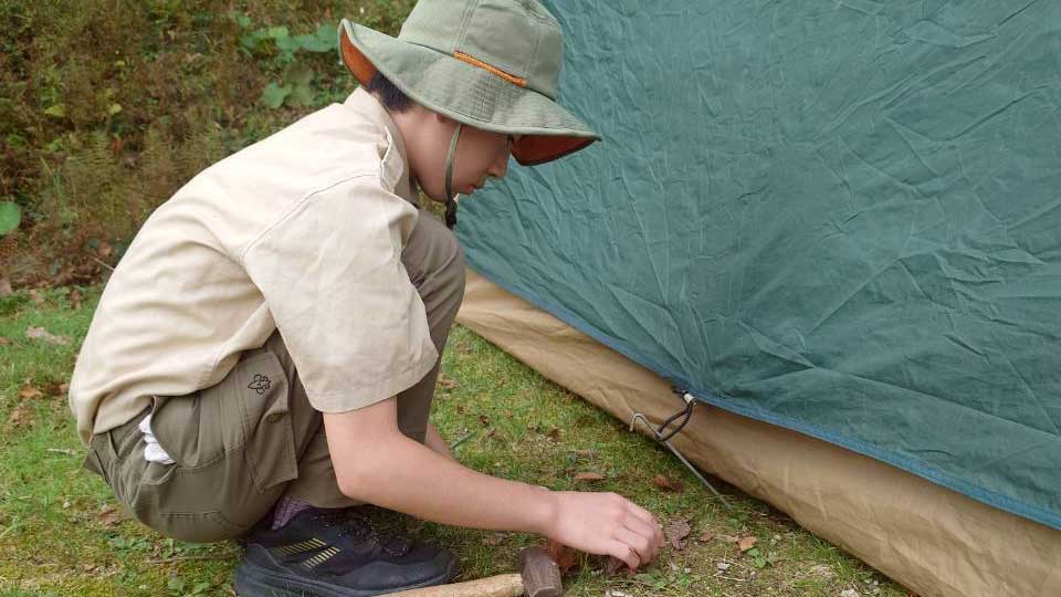 最初の課題はテント設営です。いつもは仲間と協力して立てる作業ですが、今回はそれぞれが「一人で建てる」ことに挑戦します。団の装備として使うテントは大きく、一人ではかなり大変。それでもスカウトたちはロープの張り方やポールの扱い方を確認しながら、黙々と作業を進めていきました。途中、うまく立たずに苦労する姿も見られましたが、試行錯誤を重ね、最後には全員が見事にテントを立てることができました。自力でできた達成感がスカウトたちの顔にあふれていました。
