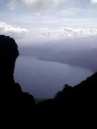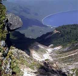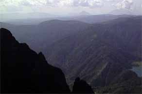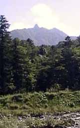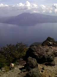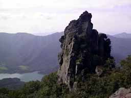 右の写真は、恵庭岳西峰の向こうに羊蹄山と岩柱の影に神秘のオコタンペ湖が眺められます。