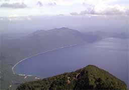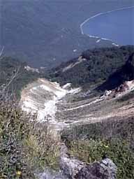 上中央写真の爆裂火口先端が見晴台です。そこから尾根づたいに外輪を登って山頂に向かいます。