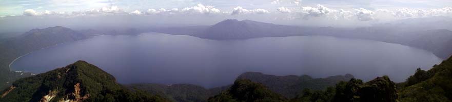 左からポロピナイ湖畔・紋別岳・支笏湖畔・風不死岳・樽前山・ホロホロ岳・徳舜瞥岳美笛湖畔の大パノラマ写真(6枚の写真合成)です。山頂から見ると支笏湖に吸い込まれそうになります。最高ですよ。