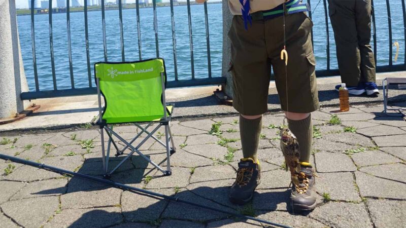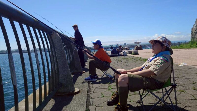苫小牧港でボーイスカウトの釣り集会が行われました。朝から青空が広がり、風も穏やかで絶好の釣り日和となりました。スカウトたちはそれぞれ自分の釣り竿を手に、防波堤の安全な位置に並んで仕掛けを投げ込みます。最初は期待に胸をふくらませていましたが、この日は魚の活性が低く、なかなかアタリが来ません。それでも、エサを工夫したり、竿を出す場所を変えてみたりと、皆で知恵を出し合いながら挑戦を続けました。
