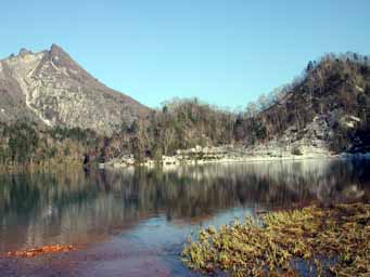 ここがフレ岳への冬コースの沢入口です。湖畔の雪は山沿いの細い部分だけです。どうがんばっても雪の上だけではここまで来られません。
