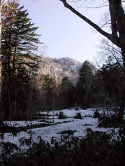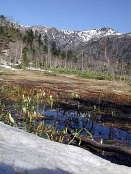 その右の写真は、湖畔入口から小漁岳・漁岳方面です。小振りながら水芭蕉が咲いています。