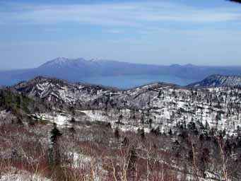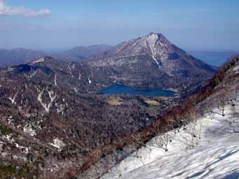 右の写真は、小漁岳から見た湖畔です。ほとんど雪がありませんが、地中は凍結しているので、ゴアの登山靴とスパッツでOKでした。 葦は寝ていて、ネマガリダケはほぼ起き始めています。