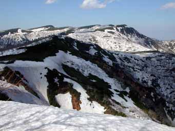 P1128からで、左手がP1015.7、中央コルが987m、中央高台が1000m分岐付近です。尾根付近のきつい北斜面では、雪がないか薄くなっています。北側の沢面には、まだ十分な雪があります。