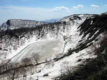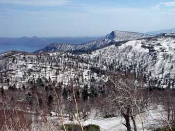 左上は、北側から見たフレ沼と丹鳴岳です。フレ沼の雪尻は、ほぼありません。