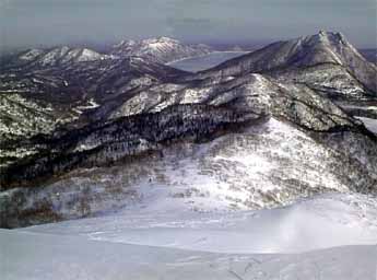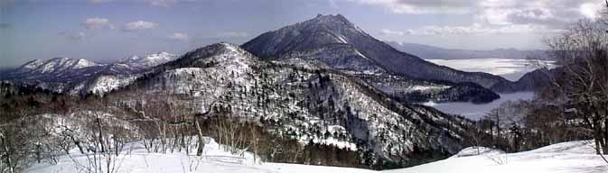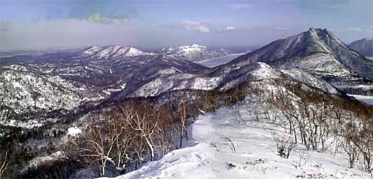 900m付近の稜線に乗ると、後方にイチャンコッペ山・恵庭岳が、横にはオコタンペ湖と23年ぶりに結氷した支笏湖、前方には小山の影に目的の魚岳が白い姿を見せていました。ここまでは、なだらかな灌木地帯です。