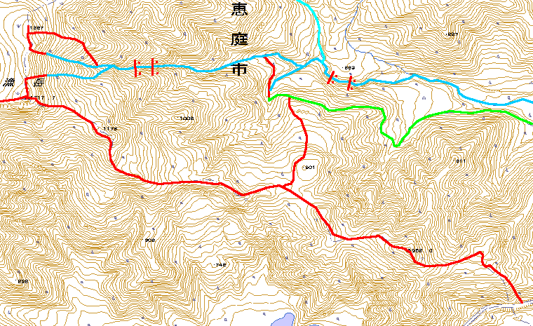 林道を100mも進むとゲート(雪の中でした。)のそばに登山届けが有ります。ここから約3,400mの道が延びていますが、約1時間進む(約3,100m地点)と緩やかな下りになる手前に、左手にとりつきやすそうな所があります。ここには、恵庭山岳救助隊が付けた赤いテープの目印が両サイドにありす。通りすぎても左に取り付くとさほど時間の違いはないと思います。