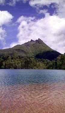 オコタンペ湖には、島があります。岩の重なり合った島に、細い木々がしがみついていました。左上の写真は、その島を挟んでの恵庭岳です。