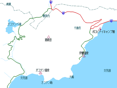 オコタン分岐-20分-千歳恵庭境界-15分-入沢-5分-湖畔-15分-展望台対岸P623m-15分-滝口-20分-展望台(直登)駐車場-10分-千歳恵庭境界-10分-オコタン分岐