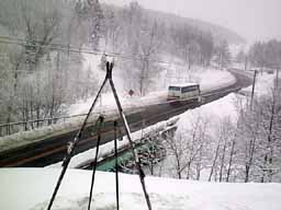 しかし、積雪状況から見て川を渡れそうにもないと判断し、橋を越えたところから尾根に取り付きました。除雪によって道路からの登りは、切り立っていました。