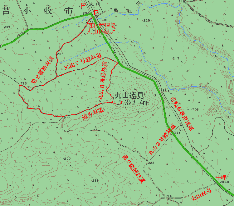 丸山休憩所(←45分 60分→)P286分岐(←10分 20分→)丸山遠見(←25分 20分→)丸山8号線林道経由国道(←50分→)丸山7号線林道経由丸山休憩所