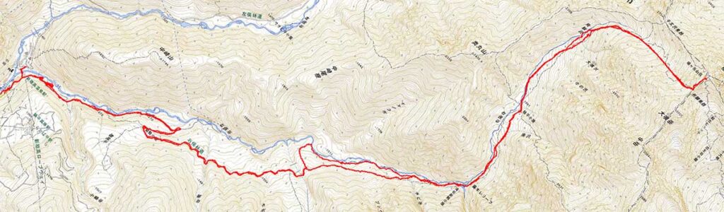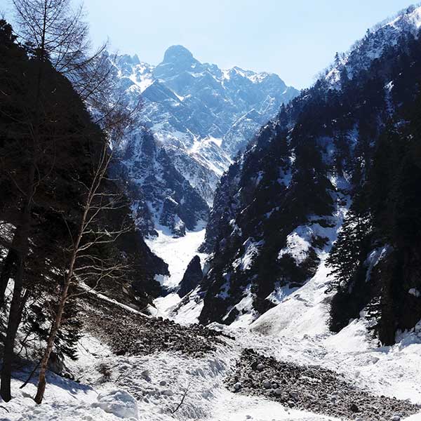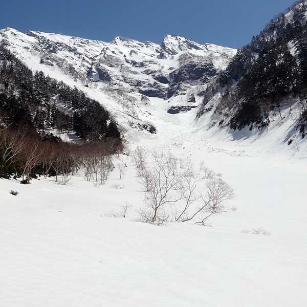 滝沢から大きな雪崩が谷に流れ込んでいる。雪崩はここだけでなく、あちらこちらの谷から流れ込んでいるが、大喰沢からの雪崩が一番大きく、かなりのデブリが積もっていた。