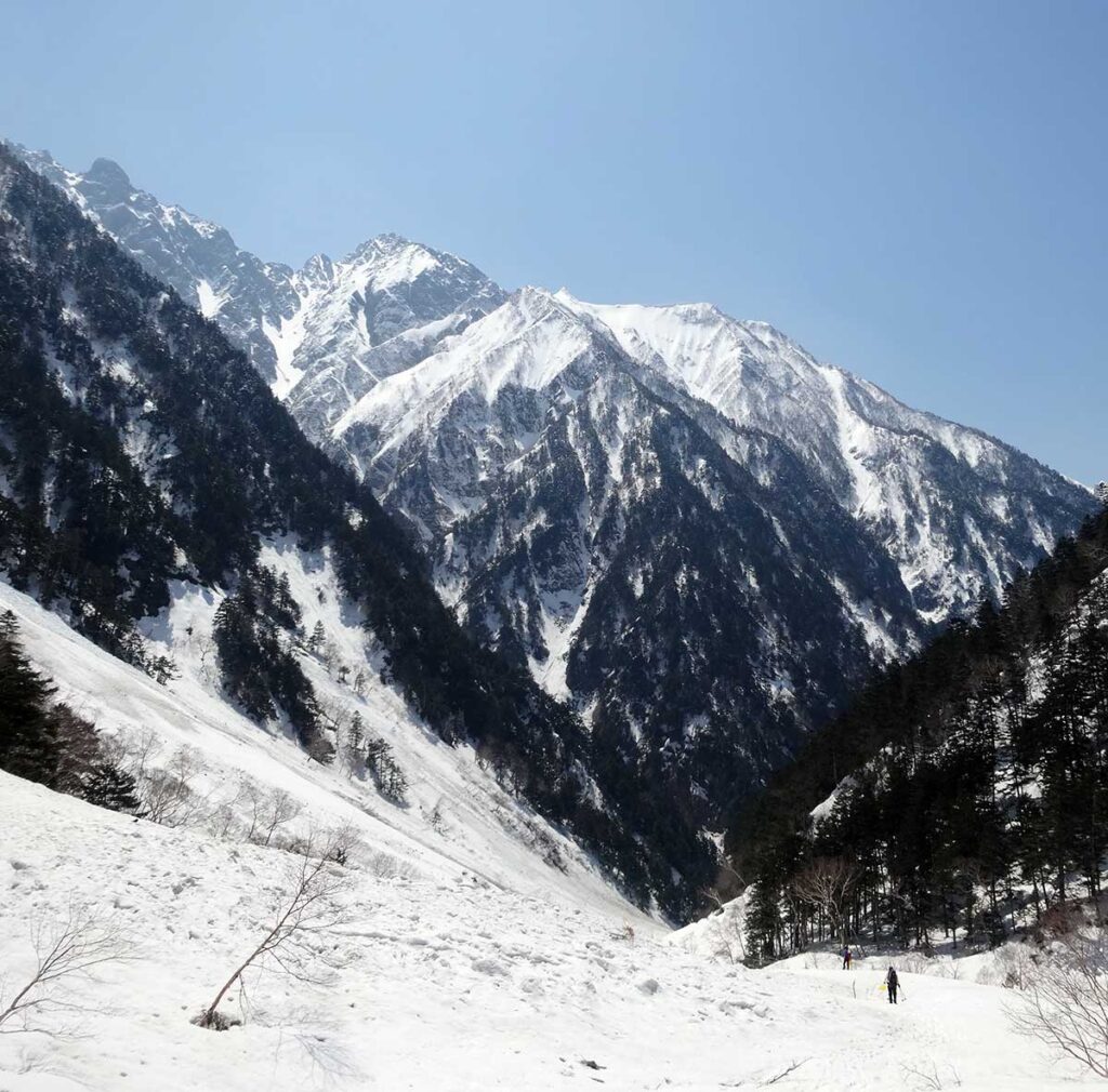 槍平手前の中間地点で、登ってきた方向だが、写真で見る傾斜より急な所だ。アルプス的画像で、いい景色だ。この日は晴天なので景色を楽しみながら登ってきたが、ここから槍ヶ岳山荘まで夏時間で5時間、新雪が降った今日はそれ以上にかかるだろう。燕岳に入ってから4日目であるが、新雪が1m降っている。登山道につながっている急こう配の谷のほとんどに大量のデブリが(雪崩たあとの雪塊)見られ、緊張しながらの通過だ。