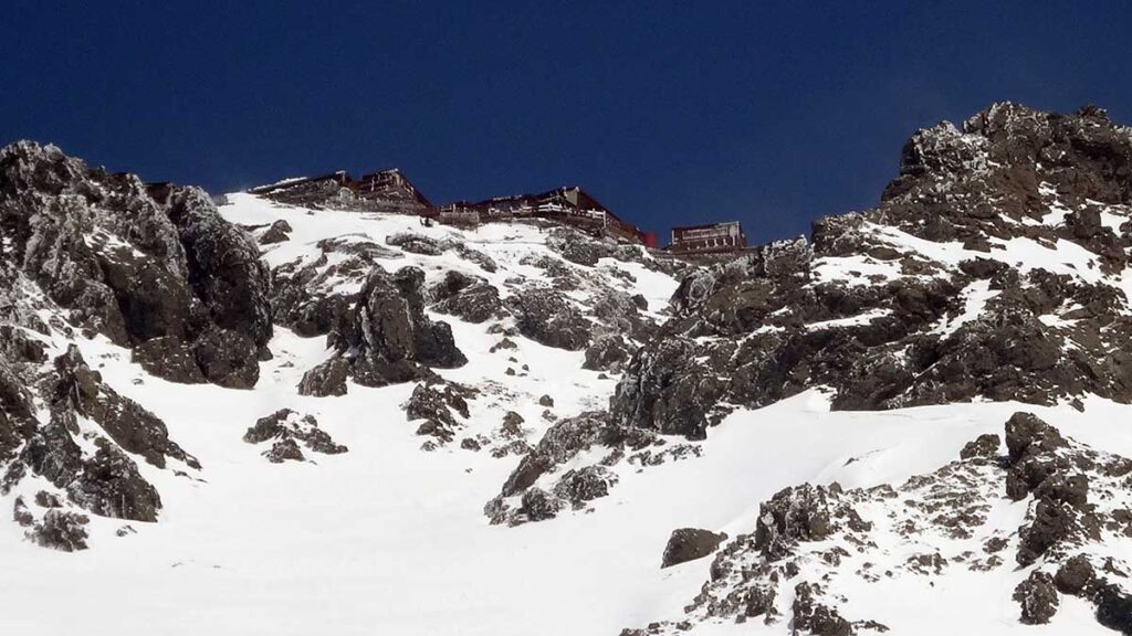 今日は日差しの強い太陽は出ているので、すでに雪が腐って(やわらかくなる。)いるので、膝まで埋まるところが多く、ここからの登りが大変だ。雪雪崩の危険な時間帯でもある。