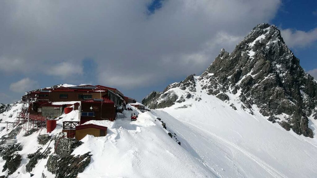 槍平から4時間30分で山荘に着いたのだが瀕死の状態である。受付で明日の天気を確認すると、槍の穂先に登るのは無理だろうと言われ「登るなら今です!」と受付の女の子に言われたが、空腹瀕死の状態を横に置き、急きょ登頂にチャレンジしようと外に出ると、同年代の登頂者から危険だからヘルメットを貸すと言われ登り始めるが、危険極まりない。