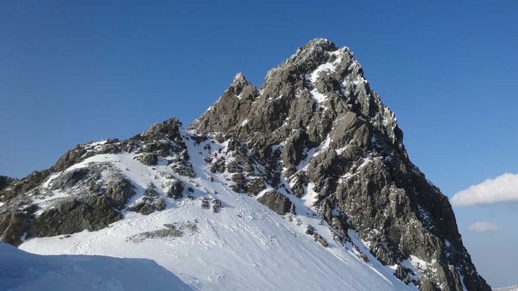 近間で撮った写真だと普通の山に見えますね。夏場は危険なところに鉄の梯子と鎖が付いているが、冬なもんで鎖は雪の中に隠れているが、ちゃんとした装備で登ると危険はありませんよ。と言っても滑落すると基部まで止まりません。中央の小さな槍が、小槍です。