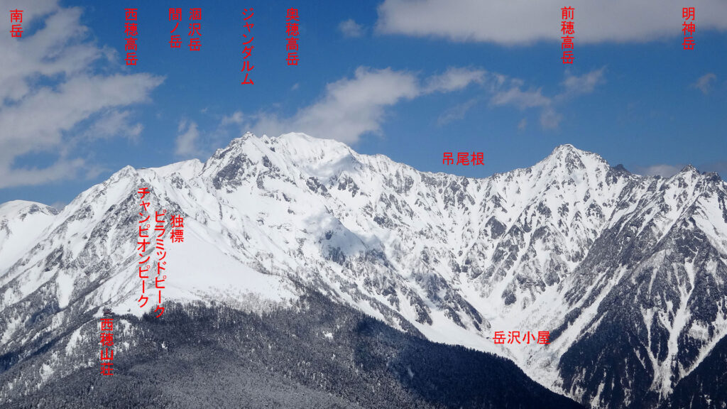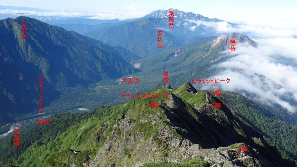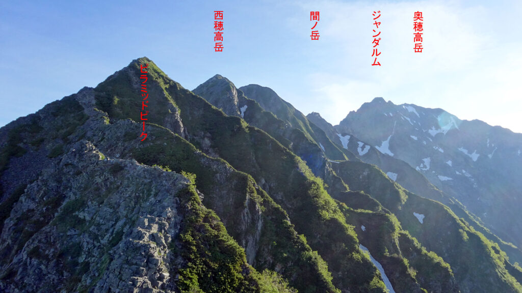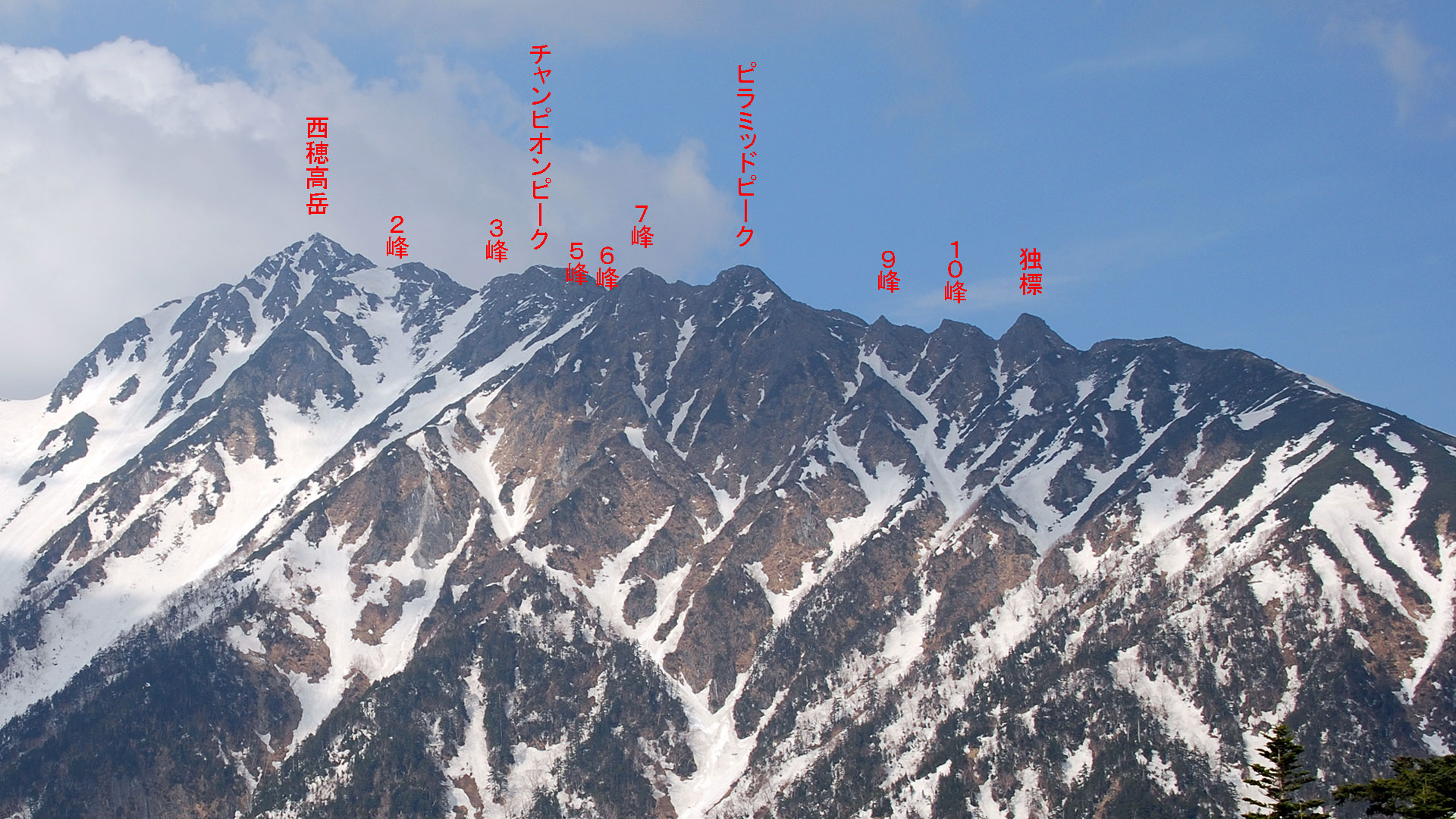 西穂高岳・2峰・3峰・チャンピオンピーク(4峰)・5峰・6峰・7峰・ピラミッドピーク(8峰)・9峰・10峰・独標(11峰)の位置図