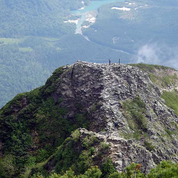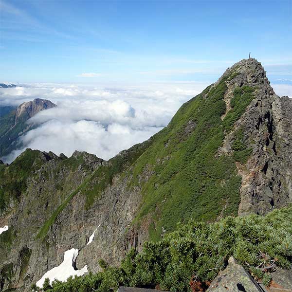 9時10分、間ノ岳あたりに差し掛かると、太陽が真上に昇り、ジリジリと肌を焼くような暑さに。360度遮るもののない岩の上、日差しを避ける場所はありません。