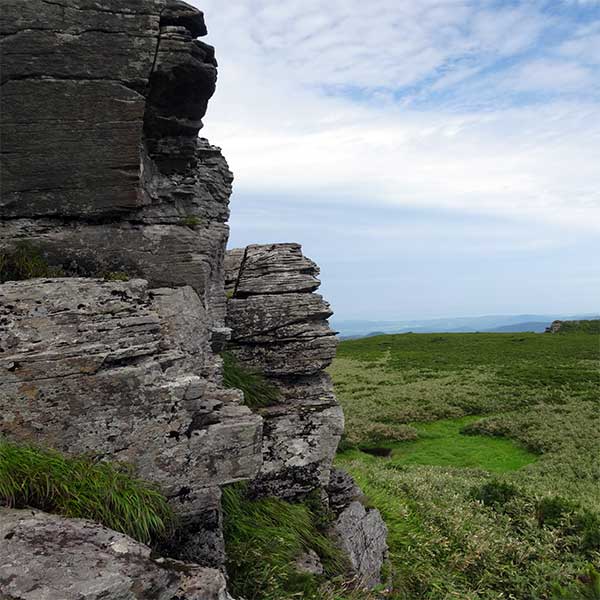 一方で、足元に目を向けると、厳しい冬を耐え抜いた高山植物たちが7月の陽光を浴びて可憐に咲き誇っています。それまでの穏やかな稜線とは対照的に、北側を覗き込めば、吸い込まれそうな垂直の断崖絶壁。このギャップこそが函岳の魅力かもしれません。