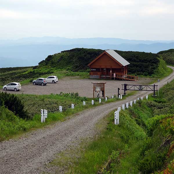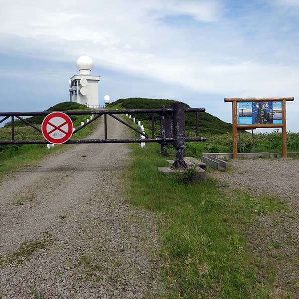 終点の駐車場に車を止めると、そこには立派な「函岳ヒュッテ(管理棟)」と広々とした駐車場がありました。ここからは歩いてすぐです。通行止めのゲートの先には、函岳のシンボルとも言える巨大な気象レーダードームが、青空に白く映えています。