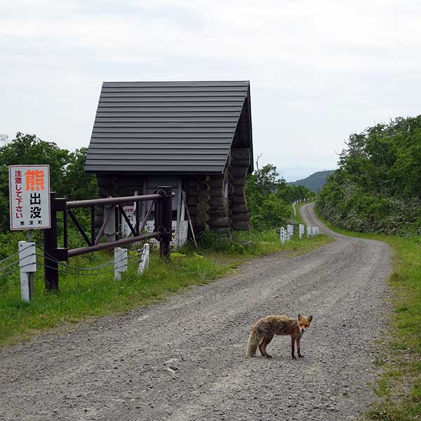 国道40号から道道680号へ入り、いよいよ未舗装の「道北スーパー林道」へと足を踏み入れます。ここからが本当の探検の始まり。林道入口では、まるで「どこへ行くの?」と問いかけるような愛くるしいキツネが、ゲートの横で見守ってくれていました。